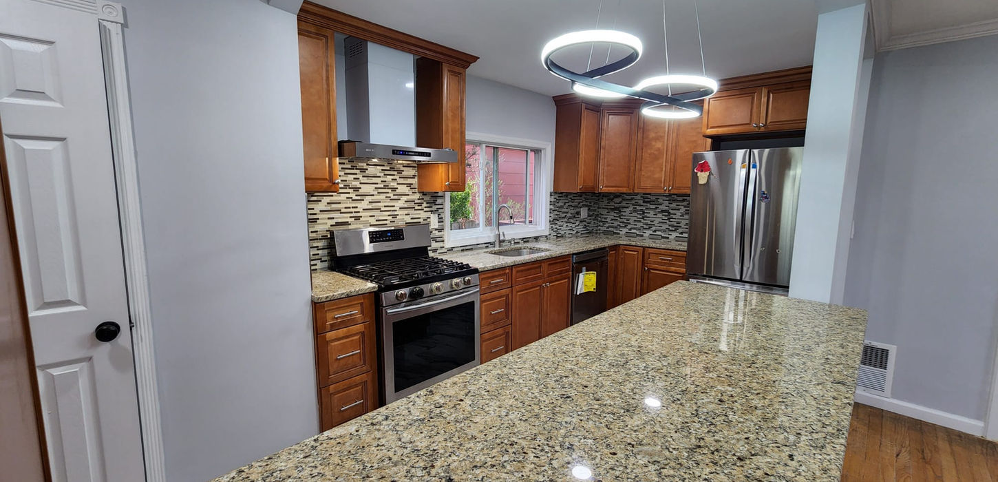 The kitchen was fully redesigned and rebuilt with custom cabinetry, a large center island, granite countertops, modern backsplash, new flooring, and updated appliances. Recessed lighting and modern pendant fixtures were added to enhance both style and usability.
