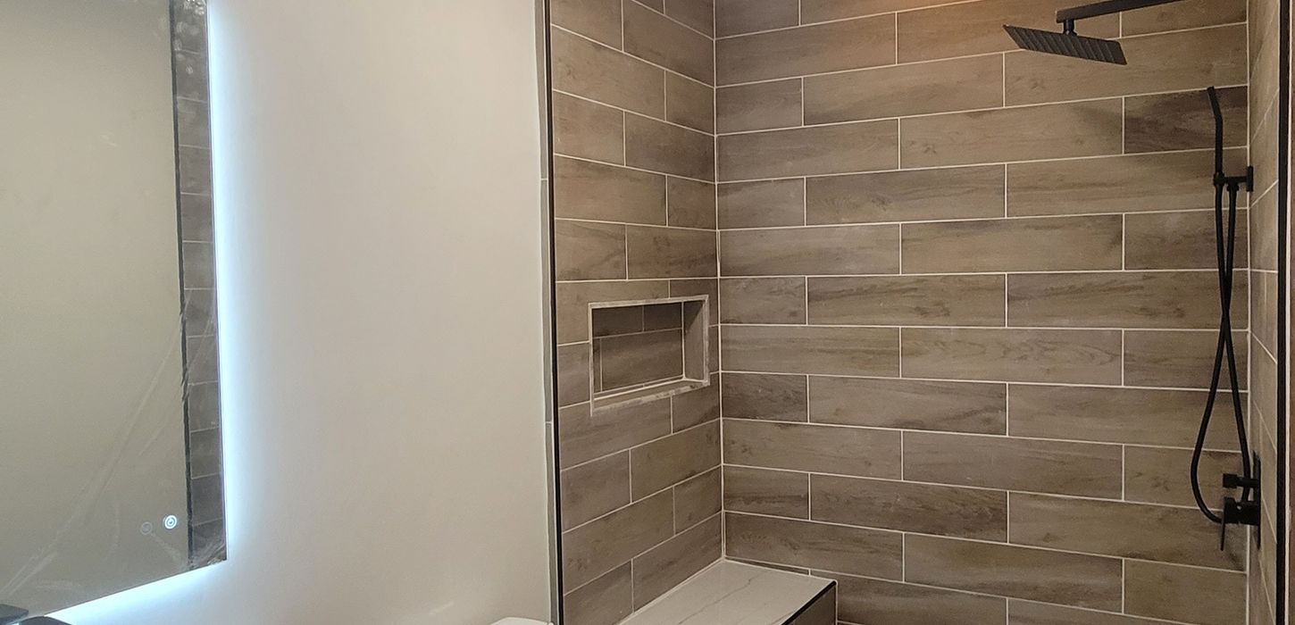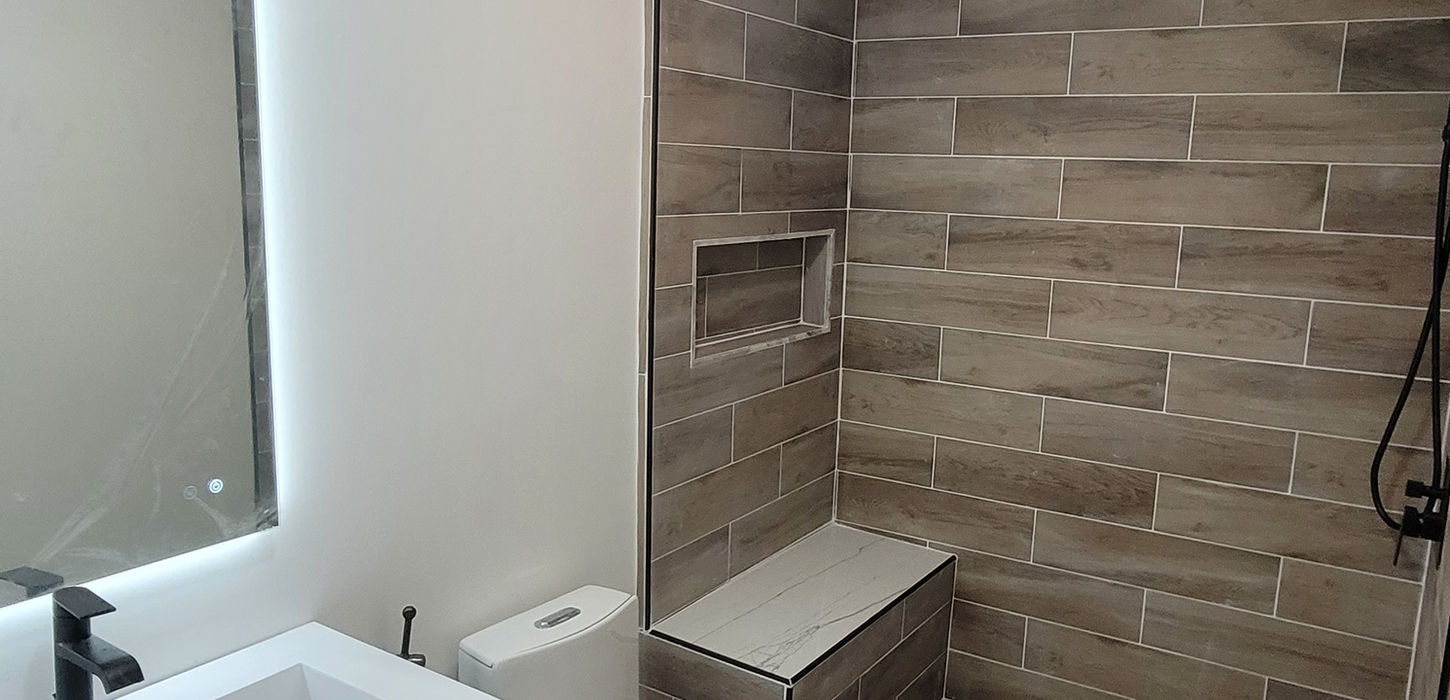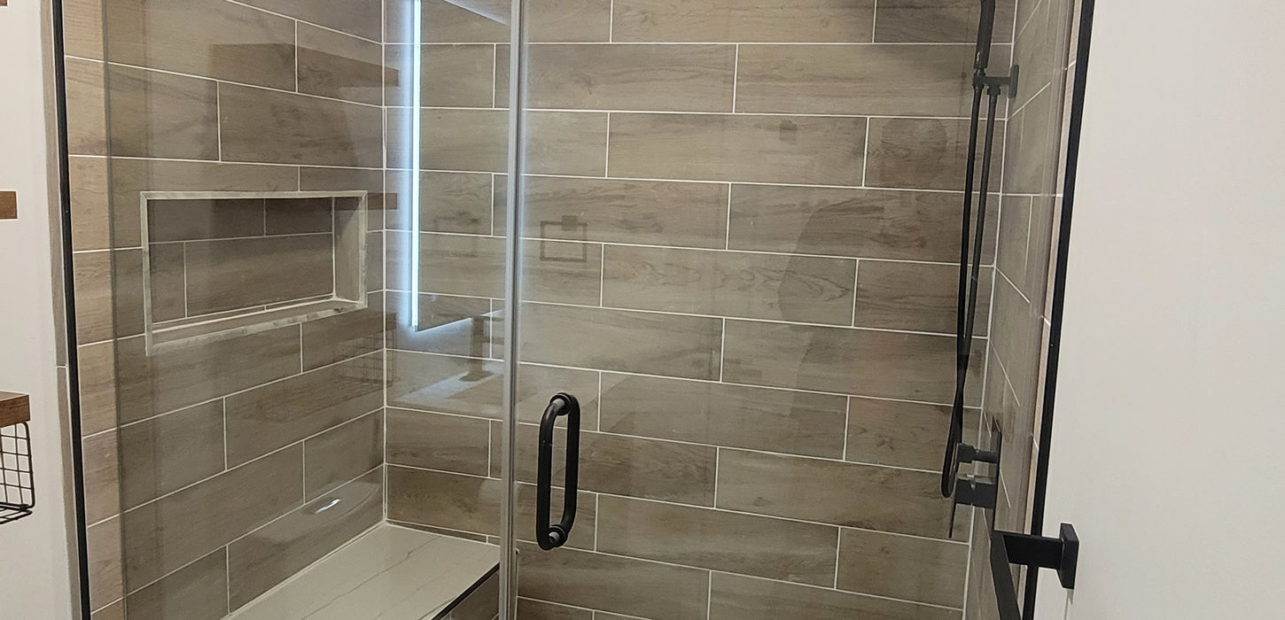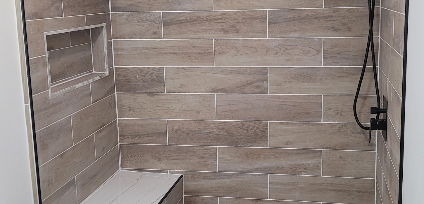 This bathroom remodel features a stunning blend of natural textures and modern elegance. The walk-in shower is finished with warm wood-look tiles laid in a horizontal pattern, creating a spa-like atmosphere with a soft, inviting feel. A frameless glass enclosure and matte-black hardware bring a clean, contemporary edge to the design.