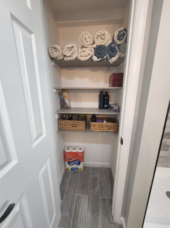 The bathroom also features updated lighting with stylish glass-shade fixtures, fresh paint, and a bright window that brings in natural light. The redesigned layout maximizes space and comfort, transforming this bathroom into a clean, functional, and beautifully modern retreat.