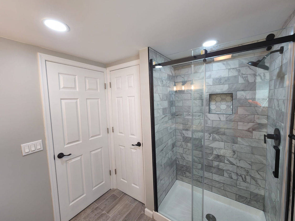 This beautifully updated bathroom features a modern, neutral design with high-quality finishes that create a warm and inviting atmosphere. The walk-in shower is the highlight of the space, finished with elegant marble-style wall tiles and accented by a custom hexagon niche for storage. Matte-black fixtures, including the sliding shower door system and rainfall showerhead, add a bold contemporary touch.