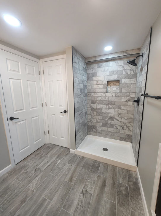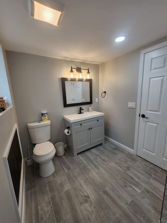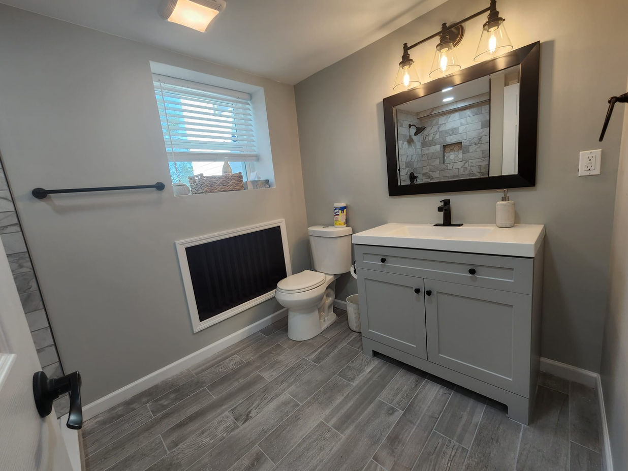 The floor is upgraded with durable wood-look porcelain tile, giving the room a natural, textured feel while staying water-resistant and easy to maintain. A sleek gray vanity with a solid-surface top, paired with black hardware and a matching framed mirror, completes the modern look.