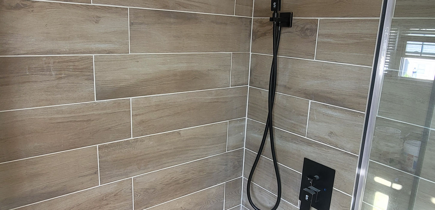 The spacious walk-in shower is finished with warm wood-look tiles arranged in a horizontal layout, creating a spa-like atmosphere. A frameless glass enclosure, matte-black hardware, and an oversized rainfall showerhead add both style and performance. LED halo lighting above the shower provides a soft, relaxing glow.