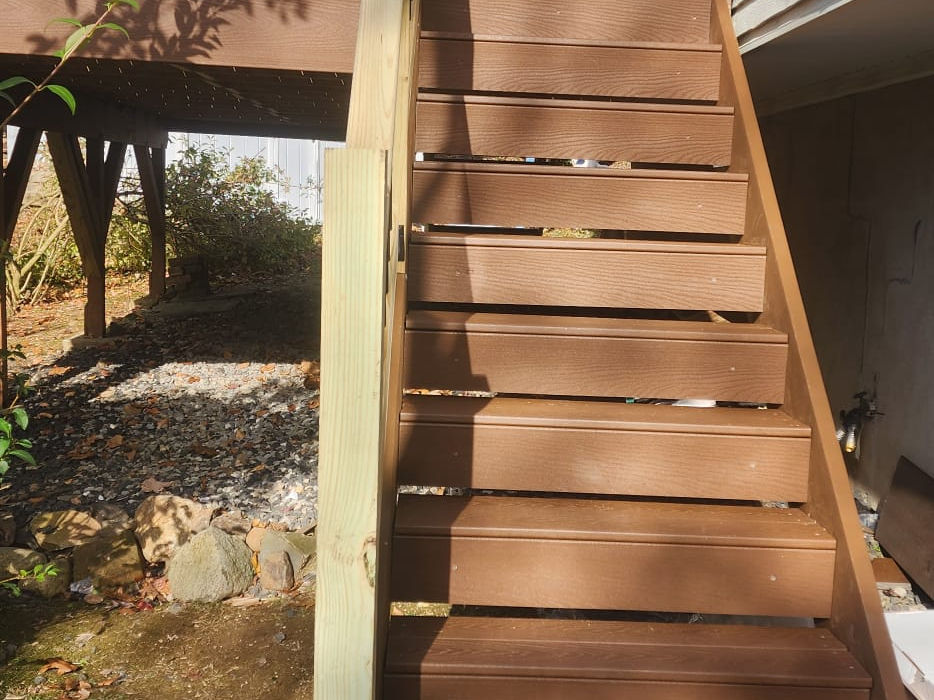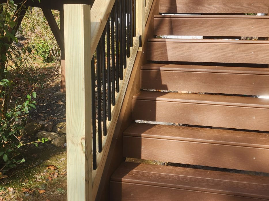 This project involved the complete construction of a custom elevated deck with stairs, designed for durability, safety, and low maintenance. The scope included new framing, concrete footings, pressure-treated structural supports, composite decking boards, and a custom stair system with wide treads for comfortable access. We installed wood posts with modern black metal balusters to create a clean, contemporary railing system that complements the home’s exterior. The finished deck provides a strong, weather-resistant outdoor living space with improved access, enhanced curb appeal, and long-lasting performance.