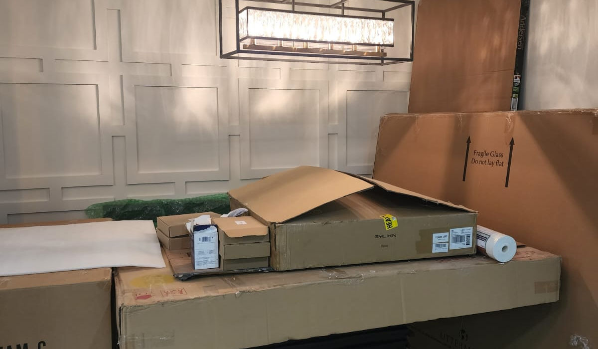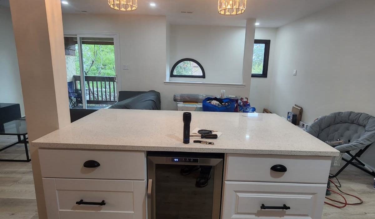 The finished electrical work delivers balanced lighting, modern aesthetics, and reliable performance, enhancing both the kitchen workspace and dining area. The combination of recessed lighting and statement fixtures provides excellent visibility while elevating the overall design.