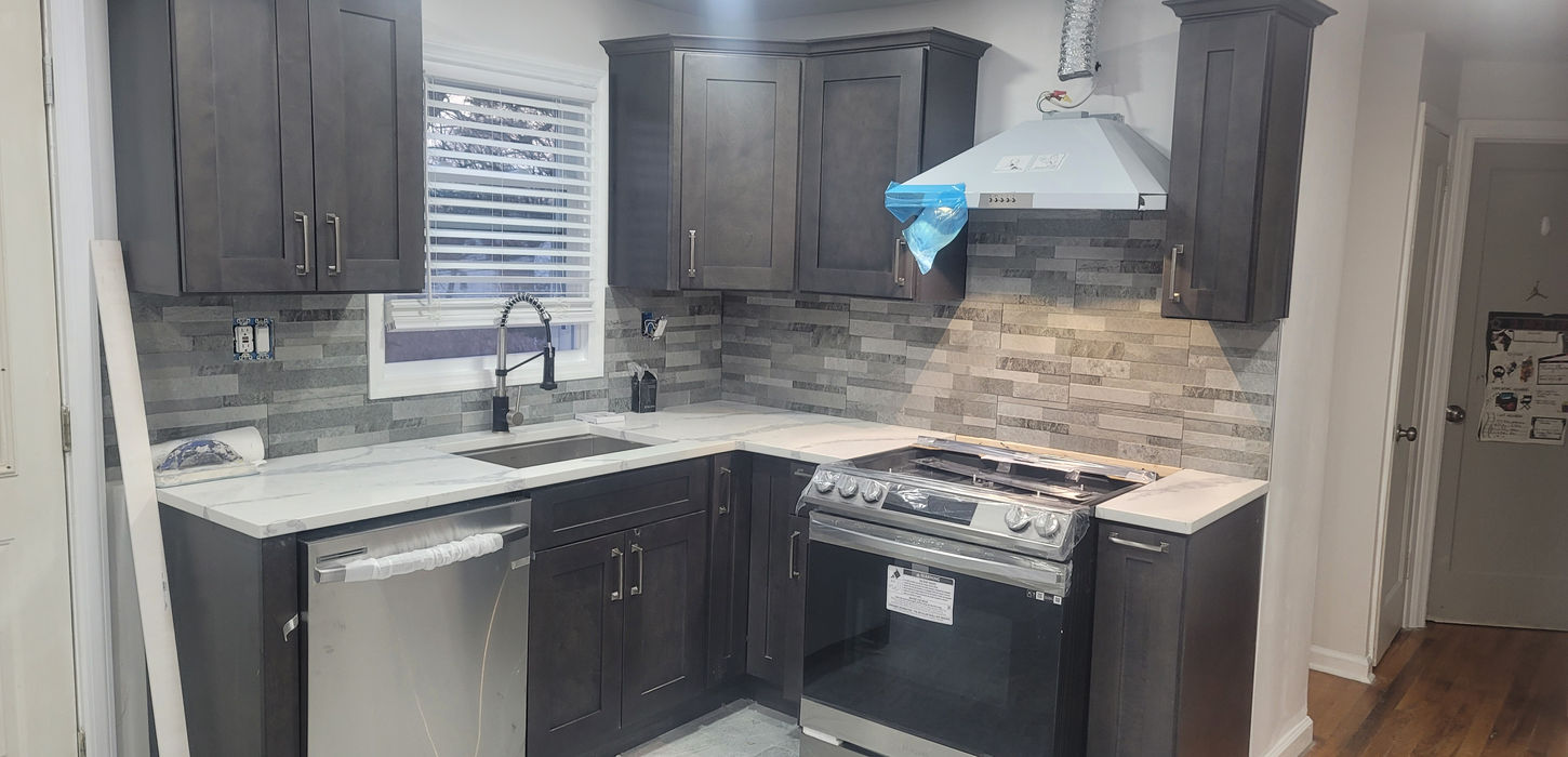 This kitchen transformation features a bold and stylish design that blends dark cabinetry with bright, modern finishes for a clean and timeless look. The rich charcoal shaker cabinets create a dramatic contrast against the light quartz countertops, giving the space a sophisticated and upscale feel.